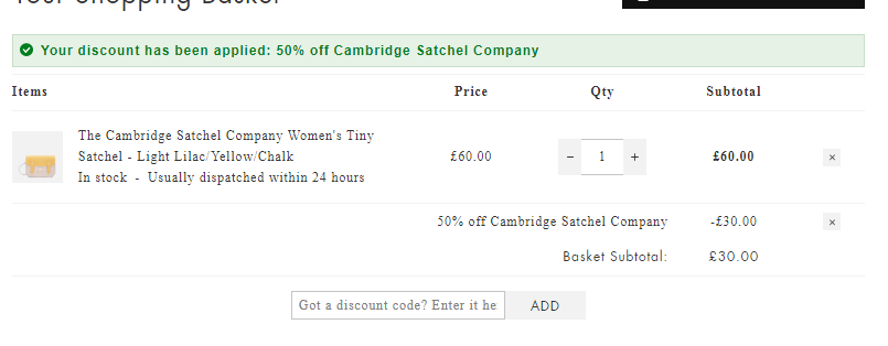 Mybag 官网:现有 超低价!The Cambridge Satchel Company 剑桥包包 低至5折 优惠活动,需要使用优惠码:CSC50 ,有效期至北京时间 2018年06月02日07点,满£40免运费。立即购买>>