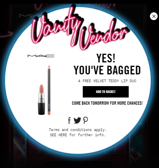 MAC 魅可 英国官网 出了一个类似抓娃娃的游戏,每次抽到的产品都不一样,抽到的赠品购物满£40就可以领取,赠品貌似可以重复抽到满意为止,每个用户每天有3次免费领奖机会。奖品包括彩妆小样和正装以及部分套装,5姐刚刚抽到*好的是正装*头口红+唇线笔套装,价值£30!活动还是很划算的~