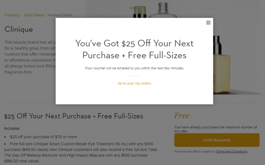 Gilt City 又有新的神券啦,现在只要注册就可以免费领取 Clinique 倩碧 官网满$75减$25的优惠券,相当于变相6.7折,订单满$100送智慧锁定修护眼部精华正装15ml(价值$49.5),新用户还加赠正装眼唇卸妆液125ml(价值$19)+ 高感光眩目睫毛膏(价值$18),相当于变相7.5折加送3件正装!这次赠品比之前送小样给力太多了,优惠券数量有限先到先得,毕竟免费领券,建议看到的先领一张再说~