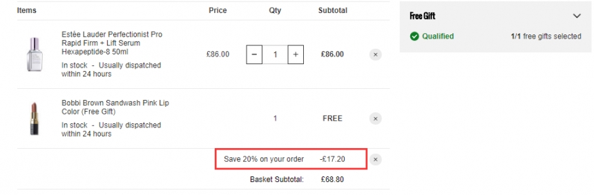 Lookfantastic 现有 【杨幂同款】Estee Lauder 雅诗兰黛 专研紧塑线雕精华素 50ml,原价£86,现特价£68.6(约589元),需要使用优惠码:LF20 ,订单满£60可自选正装赠礼,有Bobbi Brown 唇膏、倩碧紫胖子卸妆膏可选,优惠随时可能失效,品牌限制,不可直邮,需要转运。立即购买>>