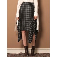 [知名博主晚晚学姐原款]不对称下摆前开叉格纹半身裙_黑色