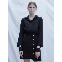 • 时尚简约翻领切口长袖女士衬衫_黑色
