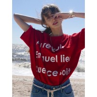 圆领英文字母图文女士五分袖长款宽松T恤_红色