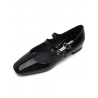 方头浅口双搭扣带漆皮女士低跟单鞋_黑色
