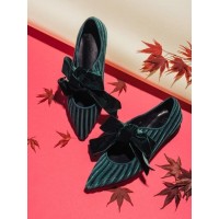[知名博主雅鲁藏布江女人 *]尖头浅口丝绒蝴蝶结条纹女士低跟单鞋_绿色