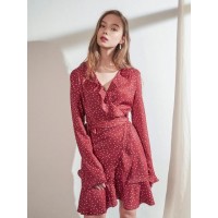 [宇宙少女俞琏静明星原款]V领褶边拼接*围裹式设计长袖连衣裙_红色