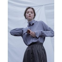 [花游记 吴涟序明星原款]时尚欧美半高领皱褶喇叭袖女士衬衫_灰色