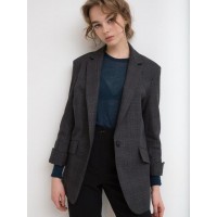 宽松格纹翻领单粒扣女士休闲西服_碳灰色