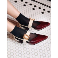 小方头搭扣带拼色粗中跟*单鞋_暗红色+白色