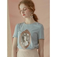 复古人像印染女士圆领短袖T恤_浅蓝色/暗粉色