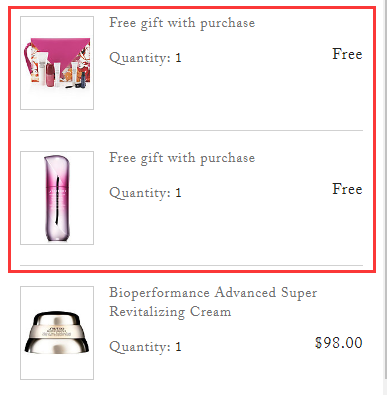 满$64送6件套礼包(价值76加元),内含:*洁面泡沫30ml,百优眼霜5ml,激能量面霜5ml,丰盈睫毛膏2ml,红腰子精华10ml,粉色花朵图案化妆包一只;满$88送新*精华5ml(价值28加元),双重满赠可叠加。