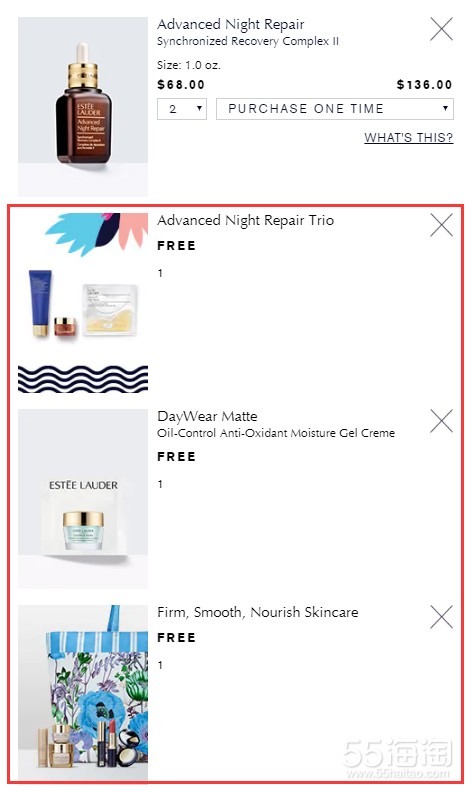 满$45送7件套礼包(价值超过$120),需要结账时手动选择,内含:倾慕唇膏正装(色号INCENSED)+ *浓翘睫毛膏旅行装 + 完美修护润唇膏旅行装 + 托特包一只 + 以下3件套礼包三选一:①多效智妍面霜+多效智妍美肌修颜乳+多效智妍精华眼霜旅行装;②全日防护复合面霜+小黄瓜眼霜+全日防护抗氧化晚霜旅行装;③小棕瓶精华液+亮肤保湿妆前乳+腮红旅行装。根据图片目测还有一个蜜粉饼小样,但是详情里没有写出来。