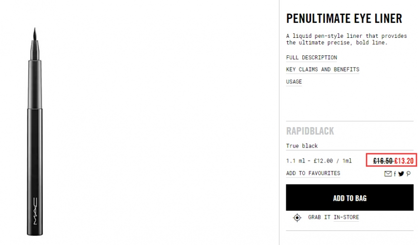 MAC 魅可 英国官网 现有 流畅精准眼线液笔 黑色,原价£16.5,现特价£13.2(约115元),线上直减无需CODE,优惠随时可能失效,满£20免英国境内运费。立即购买>>