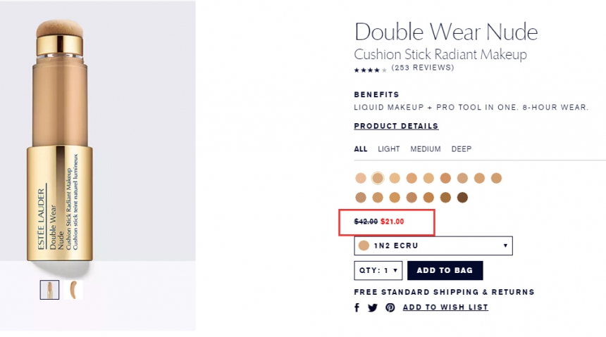 Estee Lauder 雅诗兰黛 美国官网 现有 Double wear 气垫粉底棒,原价$42,现特价$21(约139元),线上直减无需折扣码,每满$25多送一件自选小样,*多满$150送6件,赠品需要在结账时手动选择添加,有效期至北京时间 2018年08月05日12点,美国境内免邮。立即购买>>