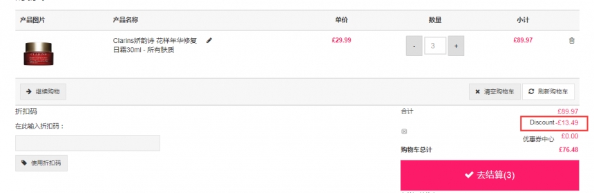Unineed Limited CN 现有 Clarins 娇韵诗 花样年华修复日霜 30ml,原价£50,现特价£25.49(约225元),两瓶享额外9折,三瓶以上享受额外8.5折!优惠随时可能失效,满£50即可免费直邮中国。立即购买>>