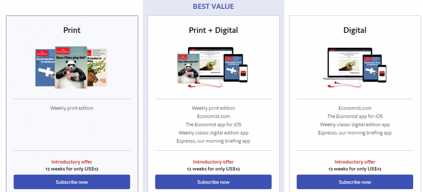 英国知名杂志 The Economist:提升你对世界未知领域的更多有趣见解 订阅《经济学人》12期仅 $12!The Economist 《经济学人》杂志现有订阅12周杂志,仅 $12,3种方式可选,包括印刷版、印刷+电子版、电子版,还送定制款移动充电宝。12周后会自动续费,可免费取消订阅。续订1~3年可获得4折到2折优惠。例如一年订阅仅$190(学生只要$142),相当于每周订阅仅$3.73。立即购买>>