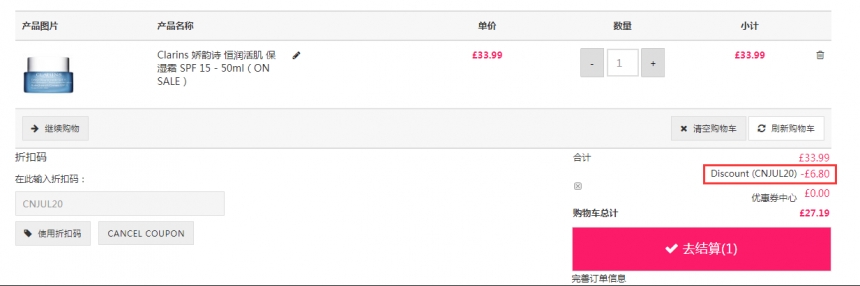 Unineed Limited CN 现有 Clarins 娇韵诗 恒润活肌 保湿霜 SPF15 50ml,原价£37,现特价£27.19(约239元),需要使用优惠码:CNJUL20 ,优惠随时可能失效,满£50即可免费直邮中国。立即购买>>