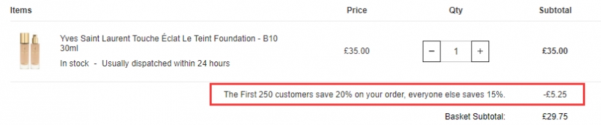 Lookfantastic 现有 YSL 圣罗兰超模光感粉底液,原价£35,现特价£29.75(约265元),需要使用优惠码:HURRY ,如失效,可尝试优惠码:DASH或者QUICK,优惠随时可能失效,品牌限制,暂不支持直邮,需要转运,立即购买>>