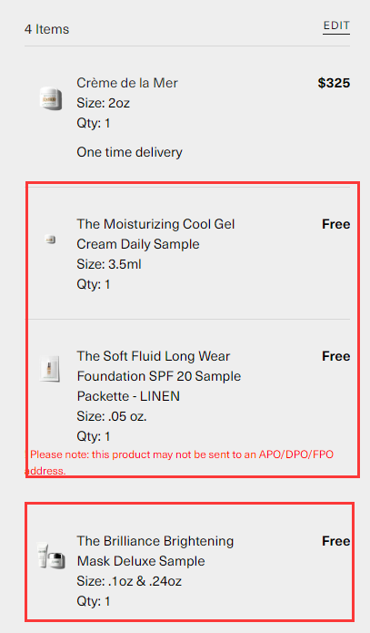 La Mer 现有 贵妇奢华护肤 无门槛送*面膜3ml&7ml+结账自选两件经典小样,需要使用优惠码:RADIANCE18 ,有效期至北京时间 2018年08月01日12点,美国境内免邮。立即购买>>