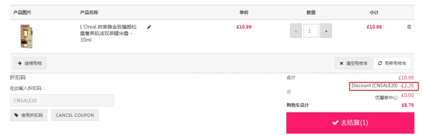Unineed Limited CN 现有 L'Oreal 欧莱雅金致臻颜精华露 30ml,原价£24.99,现特价£8.79(约77元),需要使用优惠码:CNSALE20 ,优惠随时可能失效,满£50即可免费直邮中国。立即购买>>