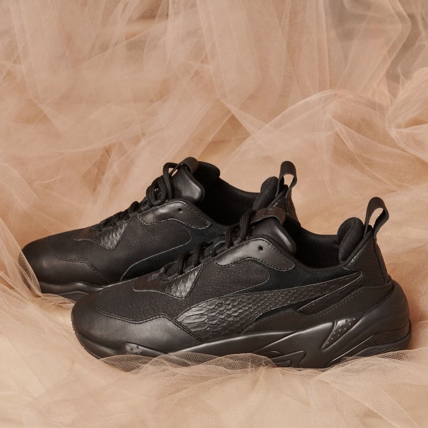 彪马于8月9日推出了纯色的新款 Thunder Desert。相较于之前 Thunder Spectra 鞋款复古的撞色和大胆的荧光配色设计,新款采用了纯粹的黑白色调,演绎沙漠中的光影辉映。本次在材质方面选用了优质麂皮、纹理皮革和网眼材质相结合的设计,结合 Thunder 鞋型标志性的夸张廓形,延续其极富张力的时尚表现。这款鞋的诞生旨在向經典联名合作的廓形致敬。其设计灵感源自于 90 年代PUMA 与 McQueen 此前合作的联名鞋款,凭借粗犷而又不言自明的一种外观设计和感觉,演绎复古风范。白色的刚上架没多久就断码了,喜欢的要手快!