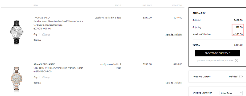Forzieri.US 现有 精选 Armani Exchange、Kate Spade、Michael Kors 等品牌精美手表 满$275立减$50 优惠活动,无需使用折扣码,结算时自动减价,有效期至北京时间 2018年08月17日,美国境内邮费$12,或者满1500元免邮中国,需要使用优惠码:FREESHIPCN ,但是两个优惠码只能二选一,不能同时使用哦。立即购买>>