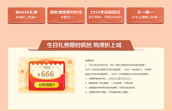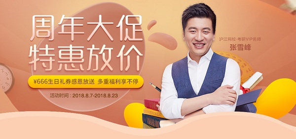 沪江网校 现有十七周年庆 考研专场,免费专属资料包+¥666礼券+限时秒杀爆款课程+底价抢购刷题班!有效期至北京时间 2018年08月23日23点59分。立即购买>>