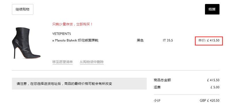 注:加入购物车输入美国的邮寄地址就能看到比单品页面更便宜的价格,她家的关税服务很到位,你在购物车中显示的价格就是英国退税和美国预收关税(订单超过£800) 的*终价格。