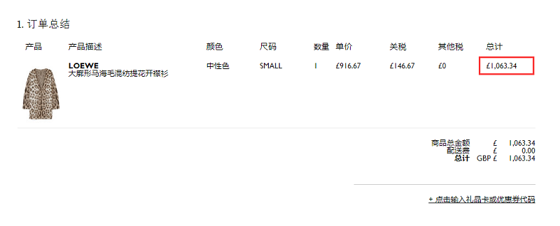 注:加入购物车输入美国的邮寄地址就能看到比单品页面更便宜的价格,她家的关税服务很到位,你在购物车中显示的价格就是英国退税和美国预收关税(订单超过£800) 的*终价格。