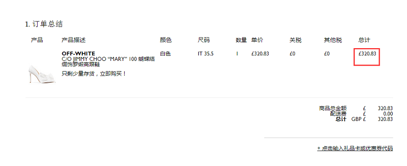 备注:加入购物车输入美国的邮寄地址就能看到比单品页面更便宜的价格,她家的关税服务很到位,你在购物车中显示的价格就是英国退税和美国预收关税(订单超过£800) 的*终价格。