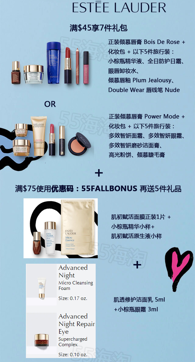 Estee Lauder 雅诗兰黛 美国官网 现有小棕瓶密集修护眼精华 15ml,售价$69(约470元),全场满$45享7件礼包礼,无需优惠码,需要点 Check Out 后选择;满$75再送3套礼包 + 2件ANR护肤小样,需要使用55专享优惠码:55FALLBONUS ,结账时可以自选1件小样,有效期至北京时间 2018年08月29日16点,美国境内免邮。立即购买>>