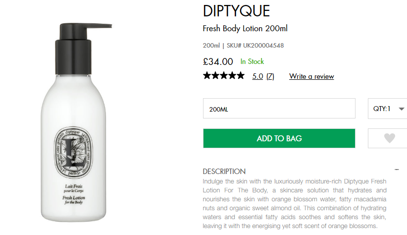 diptyque的这款身体乳真的是很热卖,diptyqe 这个品牌是5姐私心非常喜欢的香氛品牌,它们家的蜡烛和香水5姐亲测味道好闻,幸福感满满。这款身体乳是橙花的味道,非常的清新。尤其适合夏天这个季节。味道不用说,滋润度也是看得见。不黏腻好推开。值得入手哦。