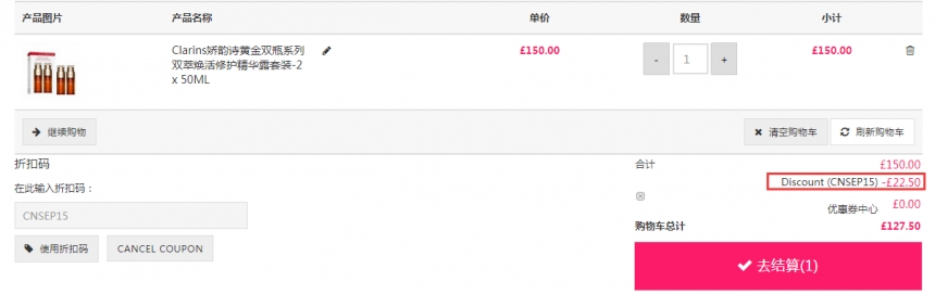 Unineed Limited CN 现有 Clarins 娇韵诗黄金双瓶系列双萃焕活修护精华露套装 2 x 50ml,原价£150,现特价£127.5(约1138元),需要使用优惠码:CNSEP15 ,优惠随时可能失效,满£50即可免费直邮中国立即购买>>