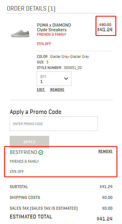 Puma US 现有 PUMA x DIAMOND 彪马 合作款 Clyde 板鞋 US5码 热卖,原价$90,现特价$41.24(约283元),需要使用优惠码:BESTFRIEND ,有效期至北京时间 2018年09月18日15点,使用该优惠码可享美国境内限时无门槛免邮。立即购买>>