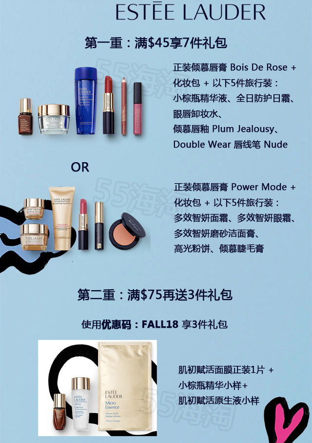 Estee Lauder 雅诗兰黛 美国官网现有 彩妆护肤香氛 满$45送7件套礼包,无需优惠码;满$75再送3件礼包,需要使用优惠码:FALL18,有效期至北京时间 2018年10月09日16点,结账时可以自选1件小样,美国境内免邮。立即购买>>