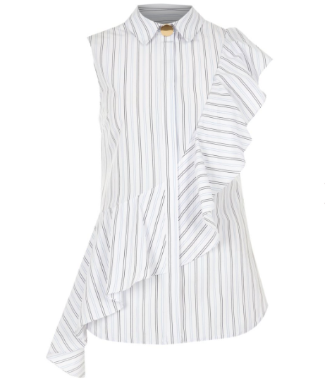 比较偏 OL 风格的一件无袖衬衣,尺码是 UK8(EUR36),条纹褶褶皱花边设计,48%棉,52%涤纶,领口有一个金属色纽扣的小心机设计,修饰身材,妹子们心动的话,可以直达购买链接,戳这里》》