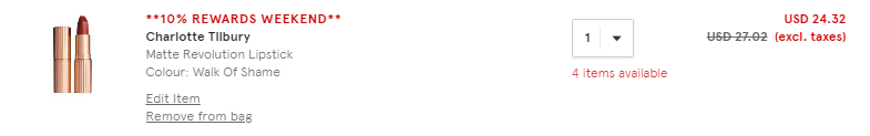 Harrods 现有 9折!Charlotte Tilbury 金管哑光唇膏 #Walk Of Shame,原价$27.02,现特价$24.32(约167元),有效期至北京时间 2018年10月01日07点,凑单至$300可以免费直邮美国。立即购买>>