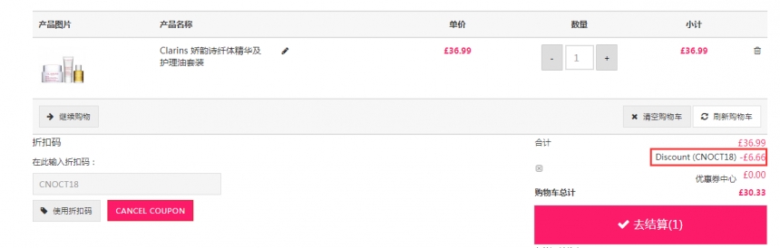 Unineed Limited CN 现有 Clarins 娇韵诗 *精华及护理油套装 ,原价£57,现特价£30.33(约271元),需要使用优惠码:CNOCT18 ,优惠随时可能失效,满£50即可免费直邮中国。立即购买>>