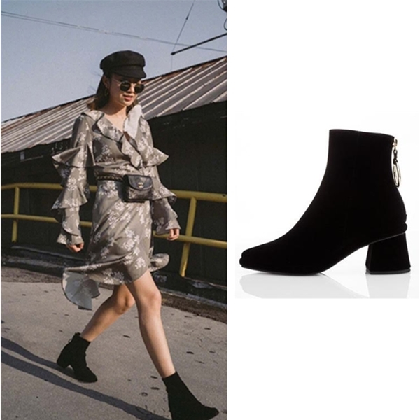 【博主 S*is 同款】Reike Nen 尖头金属圆环拉链丝绒中跟短靴