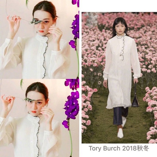 • 【迪丽热巴杂志同款】Tory Burch 新款黑色褶边装饰白色长袖连衣裙