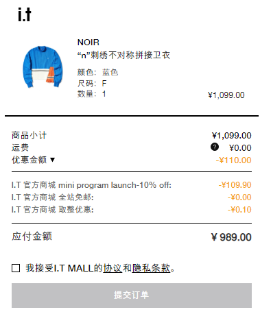 ITeSHOP 现有 NOIR 刺绣不对称撞色拼接卫衣 热卖,原价¥1099,现特价¥989,需要使用优惠码:ITESHOP90 ,有效期至北京时间 2018年10月31日23点59分,*包邮,无需关税!立即购买>>
