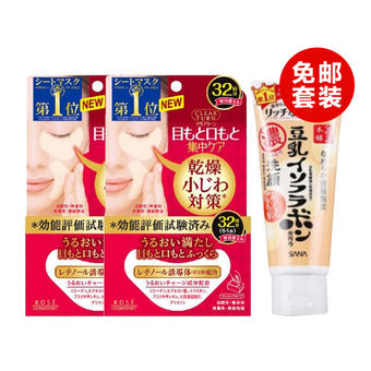 • 高丝kose 补水保湿淡细纹眼膜 64片X2+莎娜SANA 豆乳保湿弹力滋润洗面奶 150g