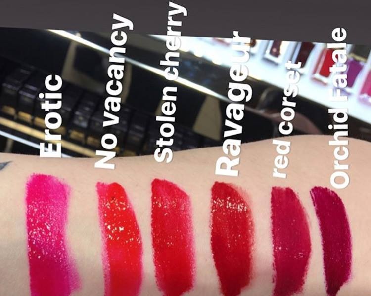 Tom Ford 2018新款唇釉系列,分了光泽、金属和哑光质地,其中光泽质地和旧版的按压唇釉质地基本上是一样的,非常有光泽感的镜面唇釉质地,像*热的R*aguer番茄血浆色以及Stolen Cherry、Red Corset都是这个质地。现在R*aguer已经断货,但是后两个色也超好看的!5姐尤其喜欢Stolen Cherry这个色,厚涂是樱桃红,薄涂就是水红色,特别特别显白气质!!!