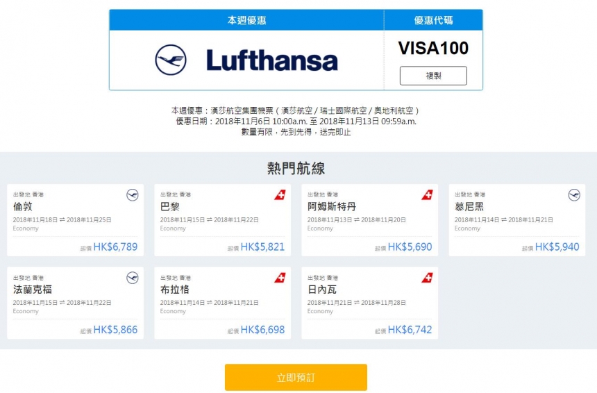 Ctrip 现有 汉莎航空集团机票 Visa *预订*机票满HK$1000立减HK$100,需要使用优惠码:VISA100 ,有效期至北京时间 2018年11月13日09点59分,立即购买>>
