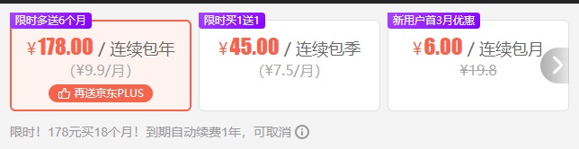 钻石月、季、年卡:5折(钻石年卡再送京东PLUS年卡)