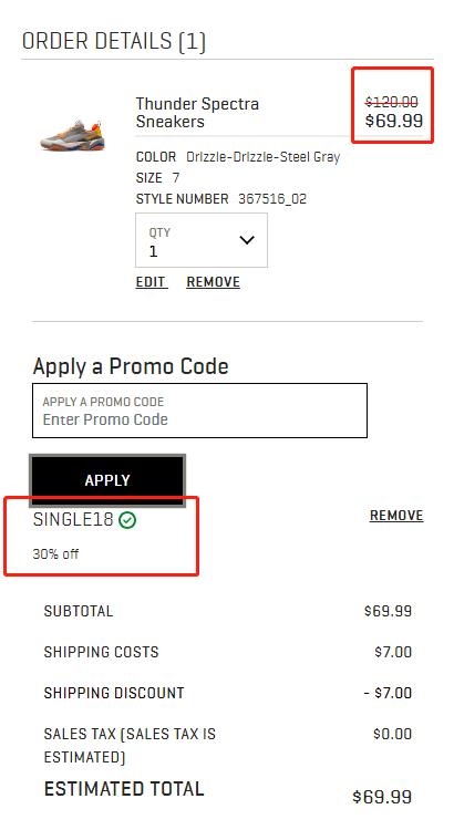 Puma US 现有 Puma 彪马 Thunder Spectra 老爹鞋 本季*新配色 热卖,原价$120,现特价$69.99(约487元),需使用优惠码:SINGLE18,有效期至北京时间 2018年11月12日16点,注册会员结账可享免费的美国境内2日达服务。立即购买>>