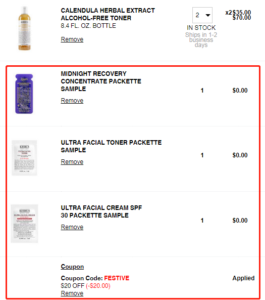 Kiehl's 科颜氏 美国官网 现有 全场满$65立减$20活动, 金盏花爽肤水 250ml,原价$35,凑单价低至$25(约174元),需要使用优惠码:FESTIVE ,有效期至北京时间 2018年11月27日13点,购物车中可以自选3件小样,满$50免美国境内运费。立即购买>>