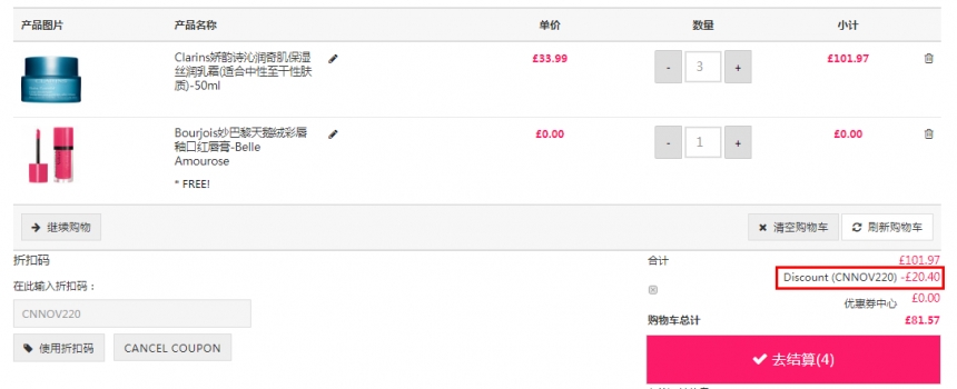 Unineed Limited CN 现有 Clarins 娇韵诗沁润奇肌保湿丝润乳霜 50ml,原价£36,现特价£27.19(约245元),1件享额外8.4折,需要使用55专享优惠码:55haitao16 , 3个以上享额外8折,需要使用优惠码:CNNOV220 ,优惠随时可能失效,满£50即可免费直邮中国立即购买>>