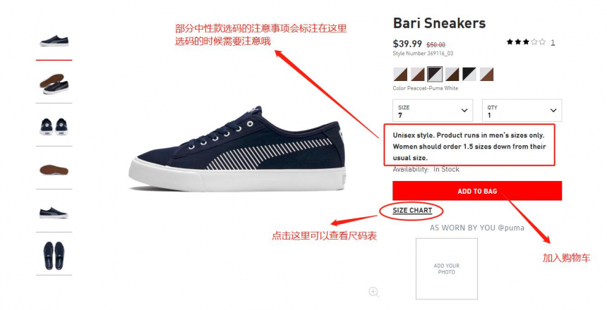 若挑好了心仪的单品,选好尺码,点击红色的【ADD TO BAG】就可以加入购物车咯!