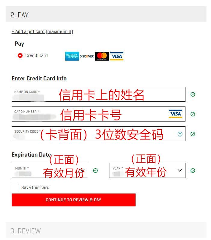第二步【PAY】是填写付款方式,Puma US 支持 Visa、MasterCard、美国运通、Discover 等*,同时也支持 Paypal 和 PUMA Gift Card 付款。